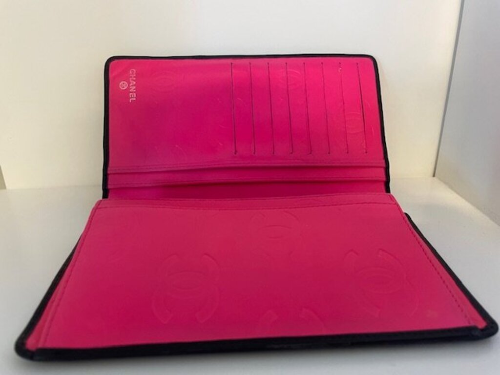 Experience the elegance of the Chanel Cambon Long Wallet, a chic accessory that reflects the brand's exquisite craftsmanship. This wallet is crafted from high-quality black leather and features a vibrant black and pink interior, adding a playful touch to your essentials. The signature CC logo in glossy patent leather is a striking element, perfectly merging traditional elegance with contemporary style. With its compact size and fashionable design, this wallet is ideal for daily use or special occasions.