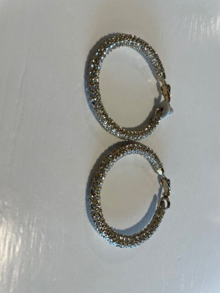 Elevate your style with these luxurious gold-tone pave crystal mesh hinged clip-on hoop earrings. Each earring features a stunning wide, rounded band encrusted with brilliant-cut clear crystals that catch and reflect light, creating a mesmerizing shimmer. Designed for comfort, they come with white pads for a secure fit on non-pierced ears. These medium-large statement hoops are perfect for formal events or to add a touch of classic Hollywood glamour to any outfit. Please note that these earrings are being sold AS IS due to the absence of the rubber piece where the ear clips on on one of them. Please note the AS IS tag. Items in AS IS condition are perfect for your home or yourself depending on what it is, but may have some slight damage or blemish. They are not in perfect condition and we implore you to ask questions or ask for additional images before purchasing.