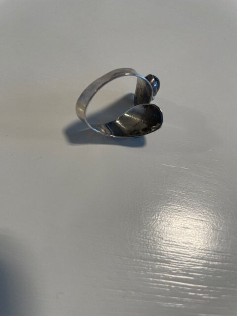 Embrace the elegance of vintage design with this striking sterling silver and black onyx bypass ring. Crafted in Taxco, Mexico, this piece showcases two smooth, oval black onyx cabochons, enhancing its luxurious allure. The sculptural silver work features a flared 'ribbon' effect, contributing to its unique aesthetic from the modernist era of the 1950s to 1970s. This authentic vintage ring exemplifies premium craftsmanship and timeless style, making it a perfect addition to any jewelry collection.