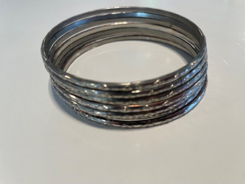 Elevate your accessory game with this stunning 7-piece textured silver-tone bangle set. Each bangle showcases a variety of intricate diamond-cut and beaded textures that reflect light beautifully, ensuring a radiant shine from every angle. Lightweight and versatile, these bangles can be worn stacked for a bold statement or individually for a more delicate touch. In excellent condition with no visible wear or tarnishing, they are the perfect addition to any luxury jewelry collection.