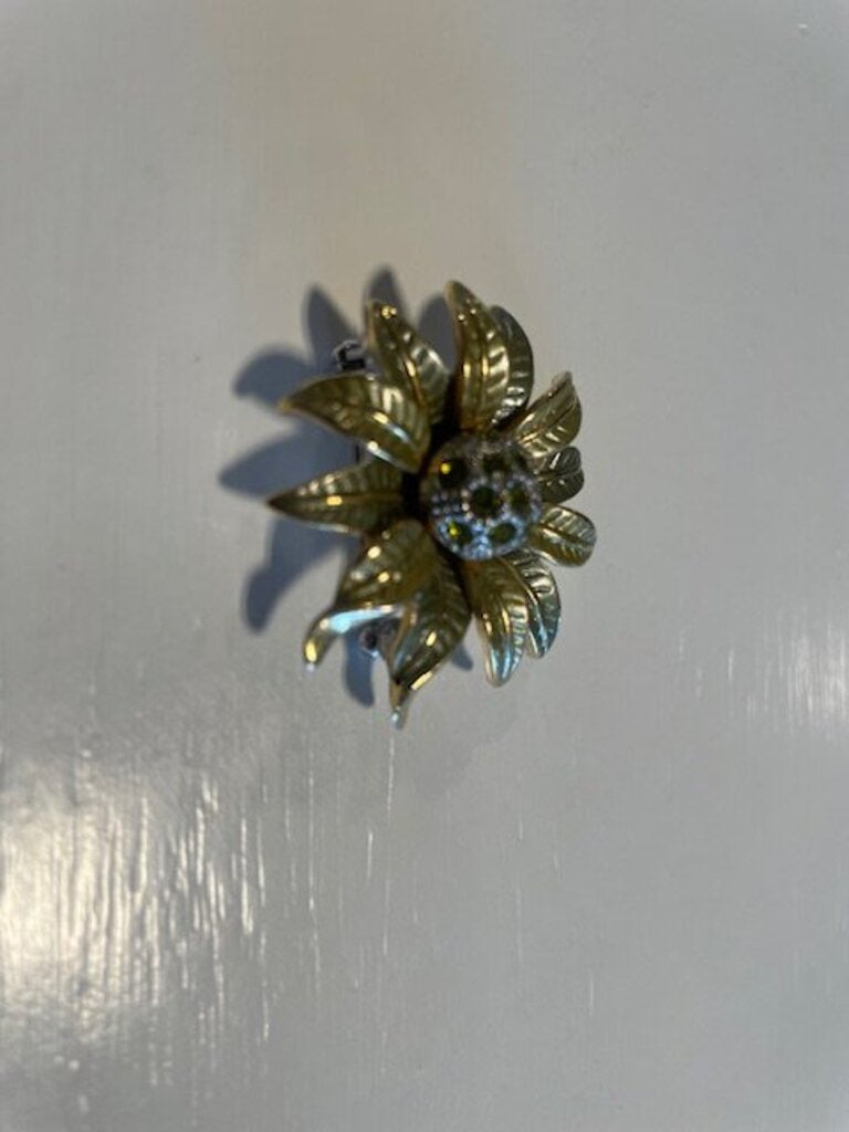 This exquisite vintage Mid-Century flower brooch is a stunning piece of costume jewelry that epitomizes classic feminine elegance. Crafted from gold-tone base metal, it features a beautifully tiered, multi-petal design with a soft, brushed finish that mimics the texture of real leaves. At its center, a raised 'pincushion' dome is adorned with shimmering peridot-green rhinestones, providing a fresh pop of color and contrast. Perfect for accessorizing a lightweight sweater, a vintage lapel, or even a chic handbag, this brooch is both compact and sculptural, making it a timeless addition to any collection.