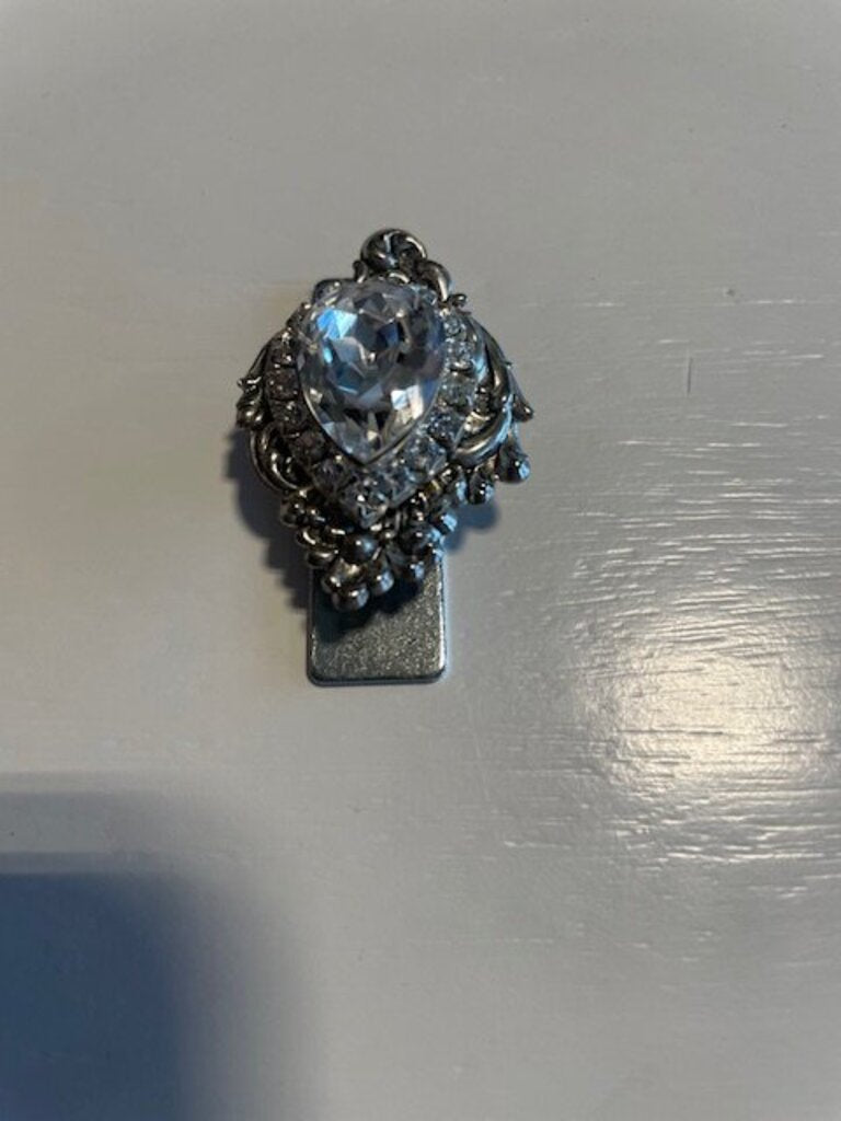 This Vintage-Style Rococo Crystal Scarf Clip beautifully merges old-world charm with modern convenience. Crafted with a silver-tone finish, it boasts an ornate design embellished with clear crystals and a striking pear-cut focal stone. The innovative dual-magnet secure grip system allows for safe and stylish fastening of scarves, hijabs, or lapels without damaging the fabric. This exquisite accessory exemplifies Victorian Revival and Baroque glamour, making it a perfect addition to any luxury wardrobe. Condition note: without leaving any pinholes.