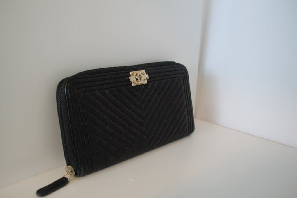 Chanel Boy Chevron Long Wallet in Black Grained Calfskin