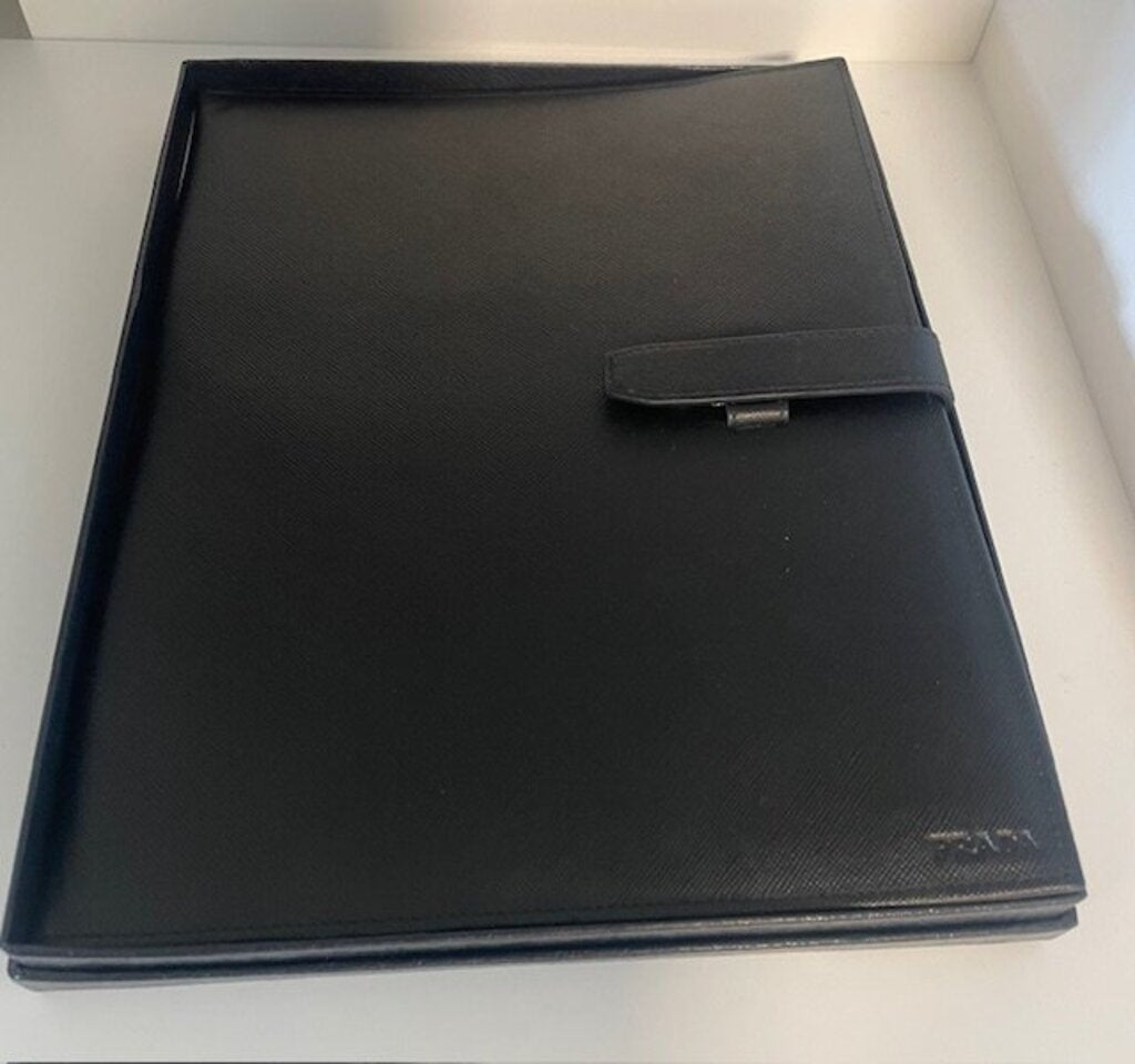 Elevate your technology accessories with this authentic Prada Saffiano iPad Case, designed specifically for the modern man. Crafted from premium Saffiano leather, this case exudes luxury while providing durable protection for your device. The sleek black finish and understated elegance make it a perfect complement to any professional setting. Featuring a secure closure and meticulous craftsmanship, this case ensures your iPad remains stylishly safeguarded. Experience the blend of form and function with this designer accessory that reflects unparalleled Italian heritage.
