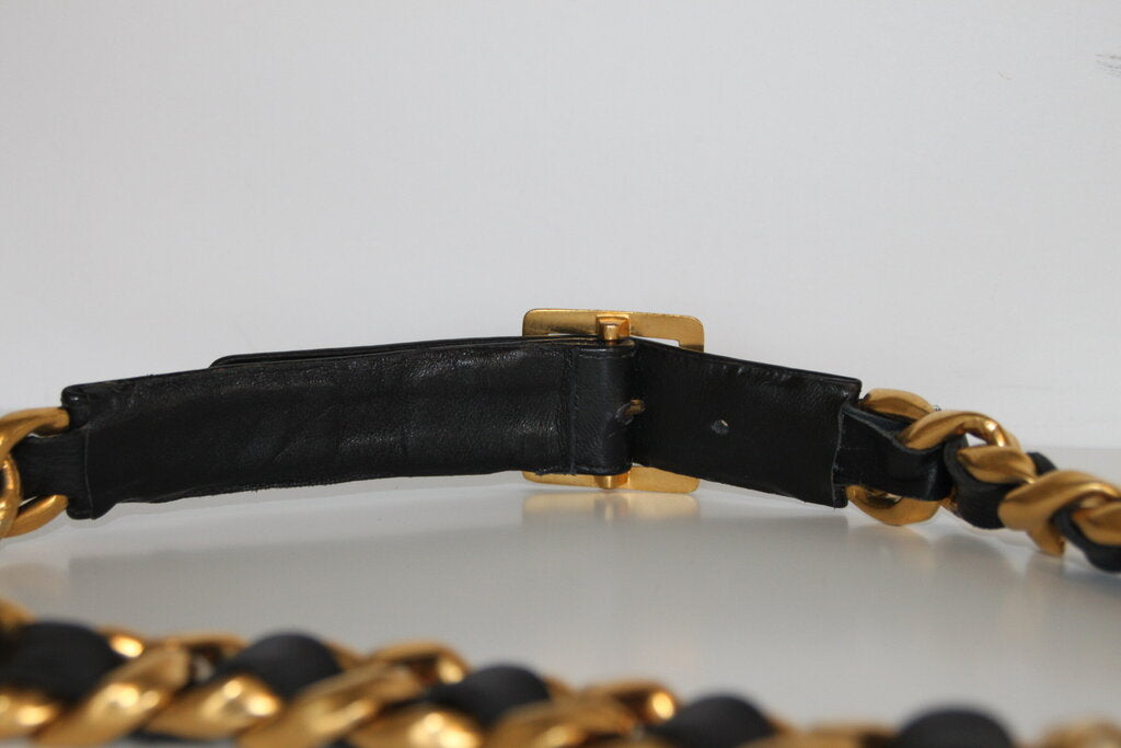 This vintage Chanel belt features a luxurious black leather strap complemented by a striking gold-toned metal chain link design and a classic square buckle. Perfect for adding a touch of elegance to any outfit, this belt is a timeless accessory for fashion lovers who appreciate the heritage of Chanel.